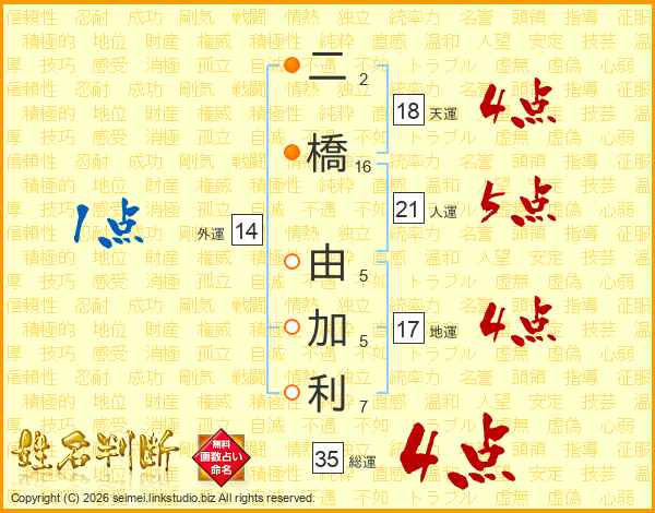 二(2画)橋(16画) 由(5画)加(5画)利(7画)