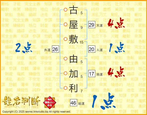 古(5画)屋(9画)敷(15画) 由(5画)加(5画)利(7画)