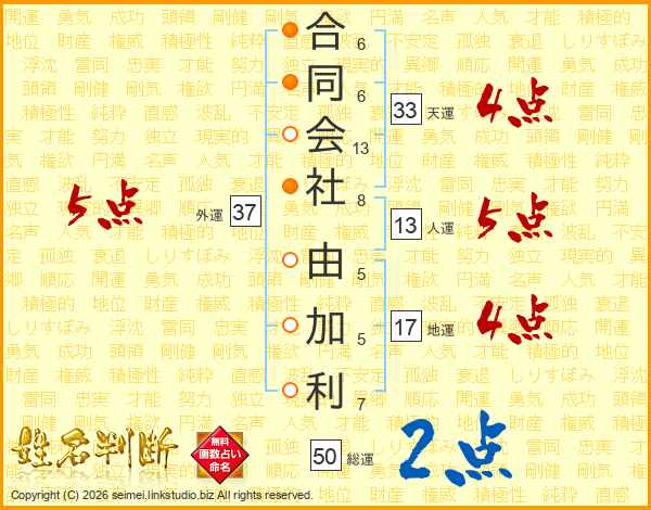 合同会社由加利さんの天運は33画の4点!