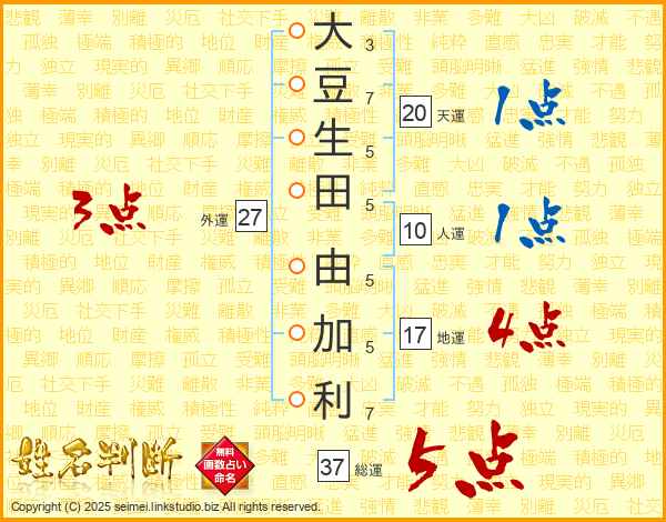 大(3画)豆(7画)生(5画)田(5画) 由(5画)加(5画)利(7画)