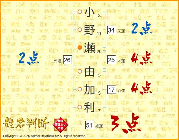 小(3画)野(11画)瀬(20画) 由(5画)加(5画)利(7画)