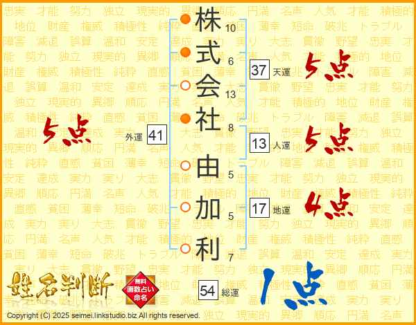 株(10画)式(6画)会(13画)社(8画) 由(5画)加(5画)利(7画)