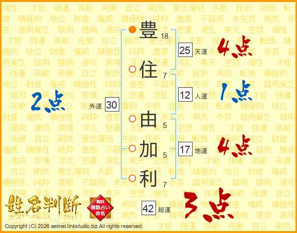 豊(18画)住(7画) 由(5画)加(5画)利(7画)