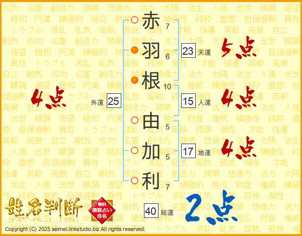 赤(7画)羽(6画)根(10画) 由(5画)加(5画)利(7画)