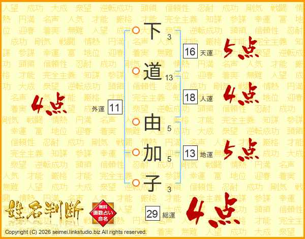 下道由加子さんの総運は29画の4点!