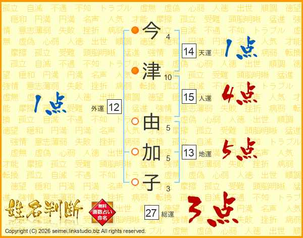 今(4画)津(10画) 由(5画)加(5画)子(3画)