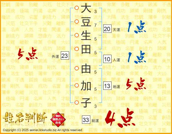 大(3画)豆(7画)生(5画)田(5画) 由(5画)加(5画)子(3画)