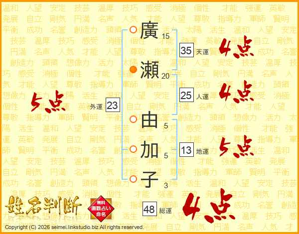 廣(15画)瀬(20画) 由(5画)加(5画)子(3画)
