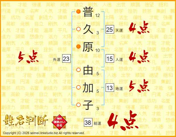 普(12画)久(3画)原(10画) 由(5画)加(5画)子(3画)
