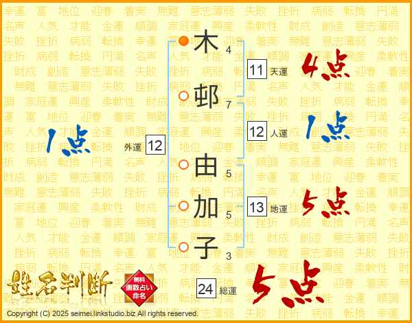 木(4画)邨(7画) 由(5画)加(5画)子(3画)