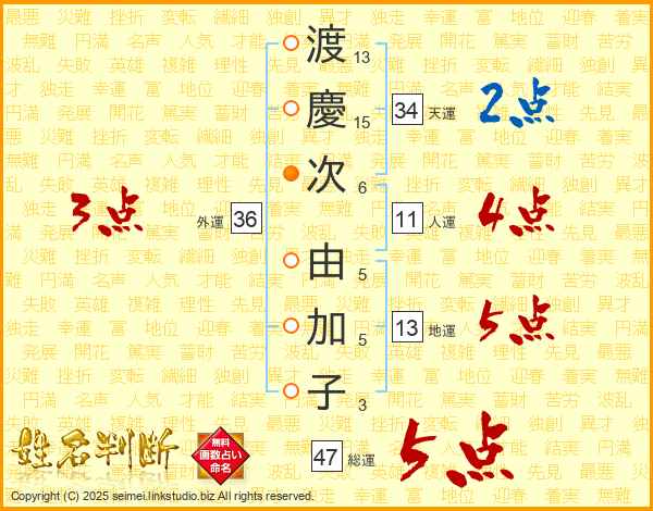 渡(13画)慶(15画)次(6画) 由(5画)加(5画)子(3画)