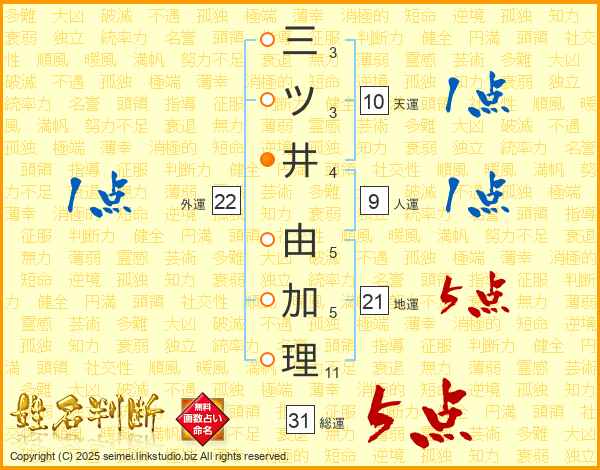 三(3画)ツ(3画)井(4画) 由(5画)加(5画)理(11画)