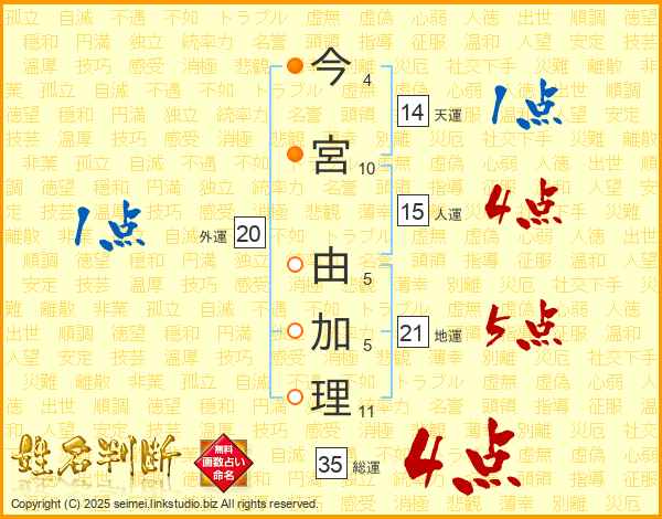 今(4画)宮(10画) 由(5画)加(5画)理(11画)