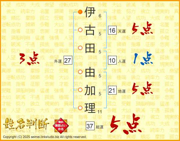 伊(6画)古(5画)田(5画) 由(5画)加(5画)理(11画)