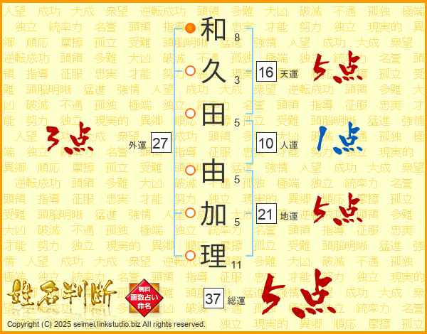 和(8画)久(3画)田(5画) 由(5画)加(5画)理(11画)