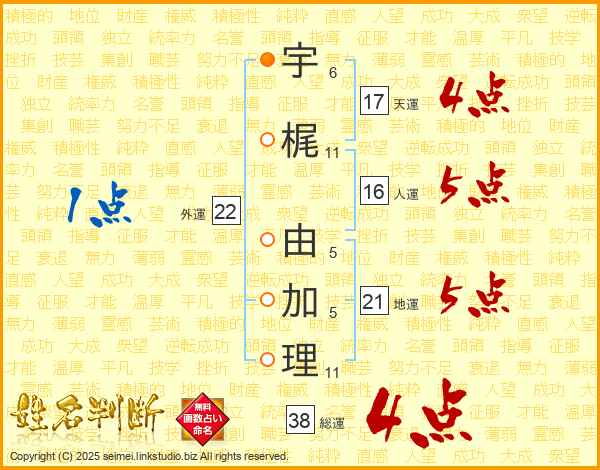 宇(6画)梶(11画) 由(5画)加(5画)理(11画)