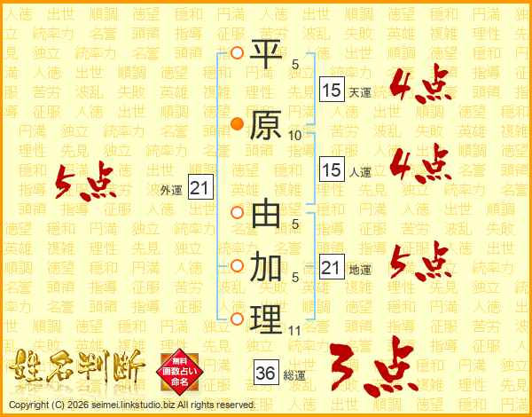 生活面を象徴する運勢です。外部から受ける影響力を表し、結婚運、家庭運や職場、環境への順応性を表します。総運から人運を引いた画数。姓や名が1文字の場合を除く。