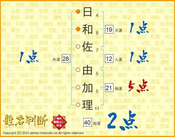 日(4画)和(8画)佐(7画) 由(5画)加(5画)理(11画)