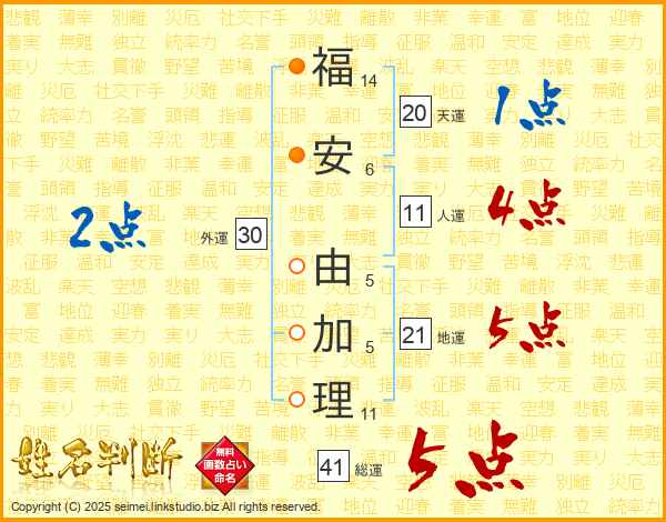 福(14画)安(6画) 由(5画)加(5画)理(11画)