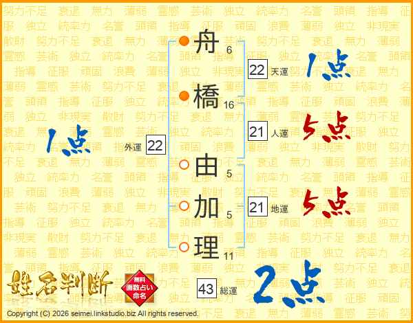 舟(6画)橋(16画) 由(5画)加(5画)理(11画)
