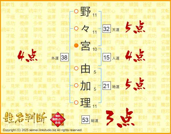 野(11画)々(11画)宮(10画) 由(5画)加(5画)理(11画)