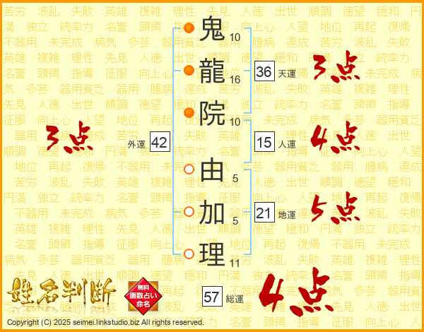 鬼(10画)龍(16画)院(10画) 由(5画)加(5画)理(11画)