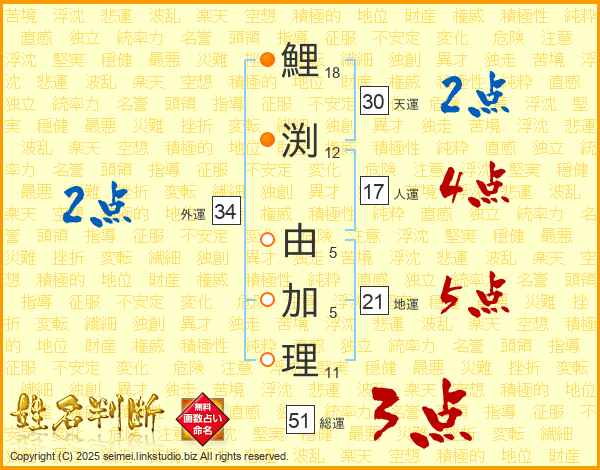鯉(18画)渕(12画) 由(5画)加(5画)理(11画)