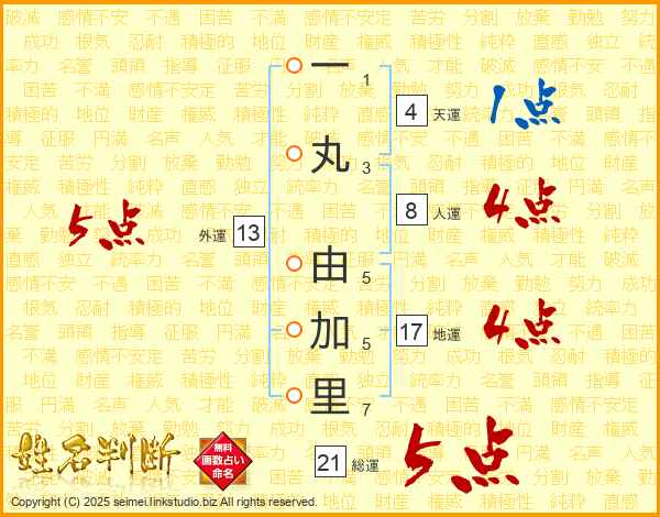 生活面を象徴する運勢です。外部から受ける影響力を表し、結婚運、家庭運や職場、環境への順応性を表します。総運から人運を引いた画数。姓や名が1文字の場合を除く。
