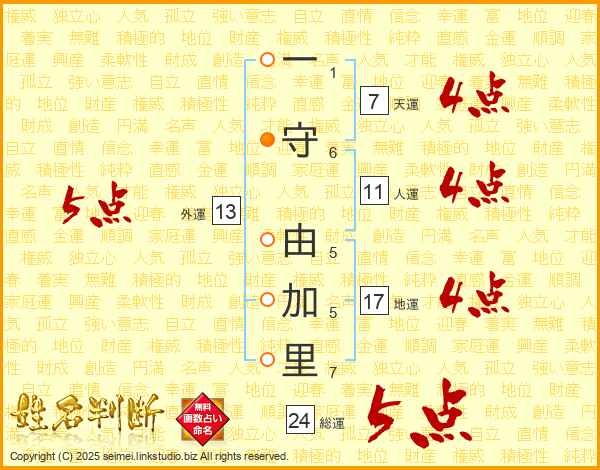生活面を象徴する運勢です。外部から受ける影響力を表し、結婚運、家庭運や職場、環境への順応性を表します。総運から人運を引いた画数。姓や名が1文字の場合を除く。