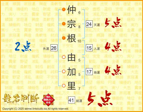 仲(6画)宗(8画)根(10画) 由(5画)加(5画)里(7画)