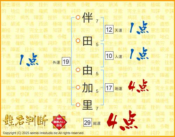 伴(7画)田(5画) 由(5画)加(5画)里(7画)