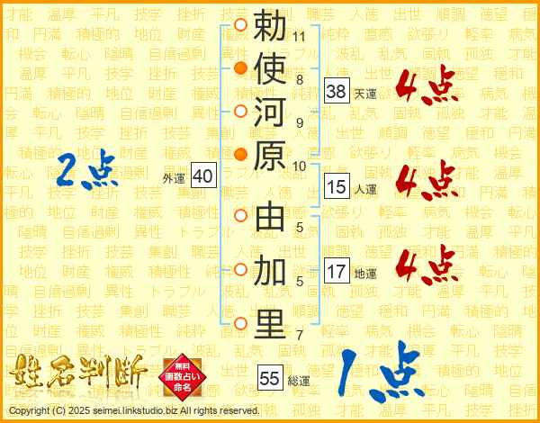 勅(11画)使(8画)河(9画)原(10画) 由(5画)加(5画)里(7画)
