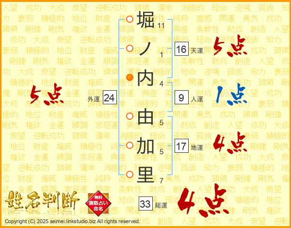 堀(11画)ノ(1画)内(4画) 由(5画)加(5画)里(7画)