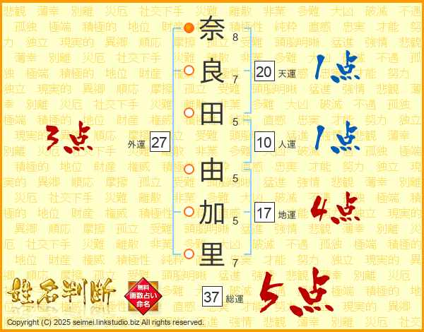 奈(8画)良(7画)田(5画) 由(5画)加(5画)里(7画)