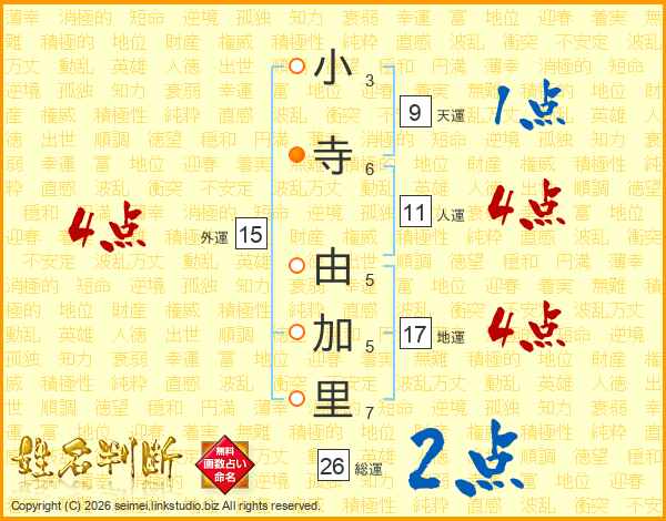小(3画)寺(6画) 由(5画)加(5画)里(7画)