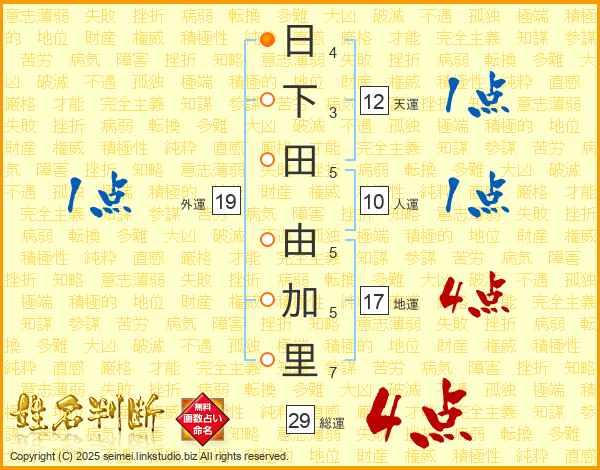 日(4画)下(3画)田(5画) 由(5画)加(5画)里(7画)