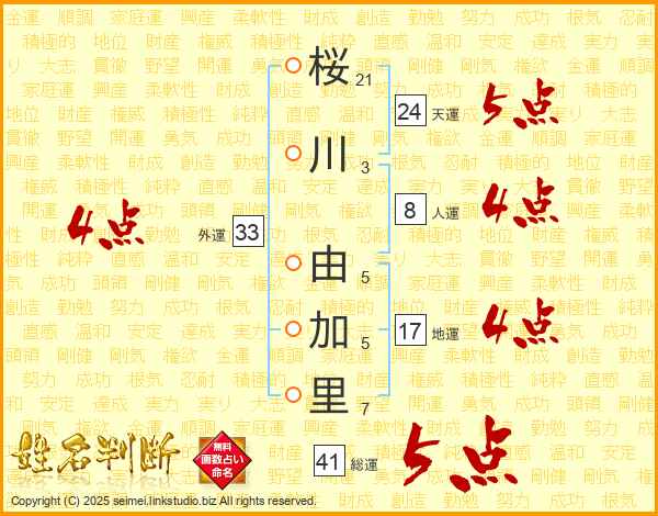 桜(21画)川(3画) 由(5画)加(5画)里(7画)