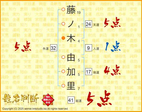 藤(19画)ノ(1画)木(4画) 由(5画)加(5画)里(7画)