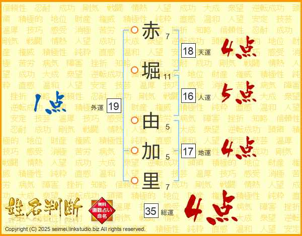 赤(7画)堀(11画) 由(5画)加(5画)里(7画)