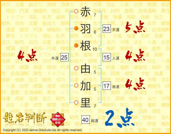 赤(7画)羽(6画)根(10画)  由(5画)加(5画)里(7画)