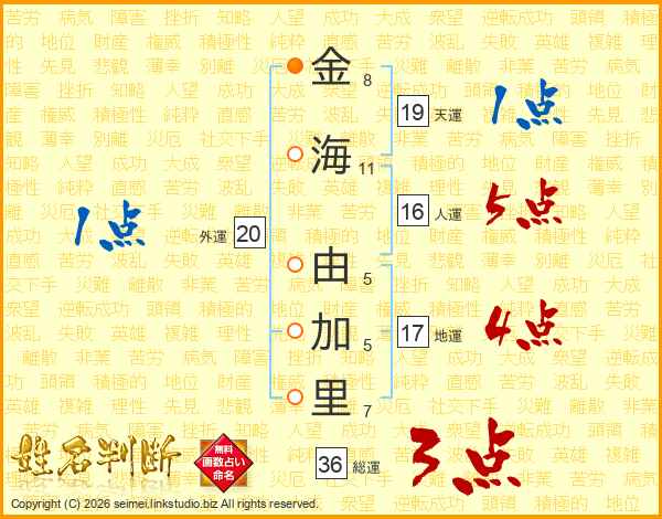 金(8画)海(11画) 由(5画)加(5画)里(7画)