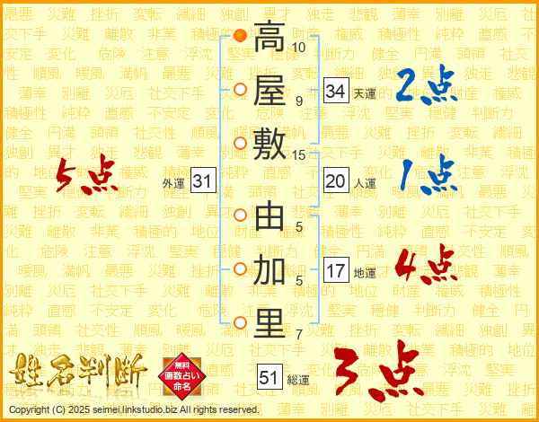高屋敷由加里さんの総運は51画の3点!