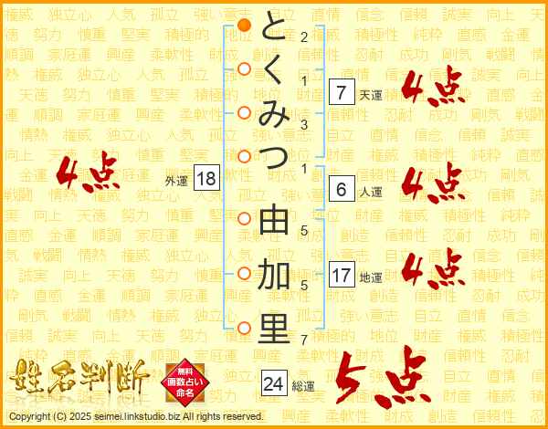 と(2画)く(1画)み(3画)つ(1画) 由(5画)加(5画)里(7画)