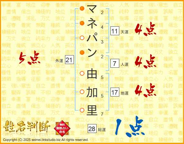 マ(2画)ネ(4画)パ(3画)ン(2画) 由(5画)加(5画)里(7画)