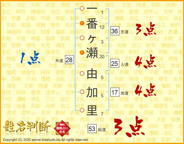 一番ヶ瀬由加里さんの人運は25画の4点!