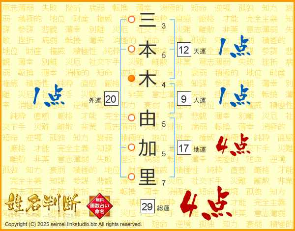 三本木由加里さんの総運は29画の4点