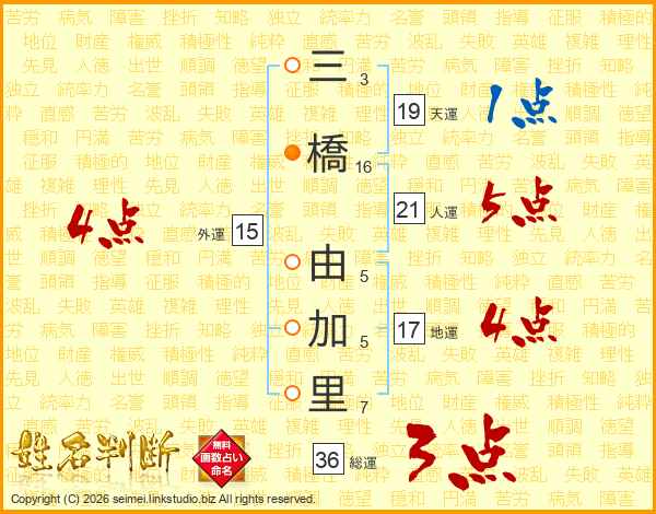 三(3画)橋(16画) 由(5画)加(5画)里(7画)