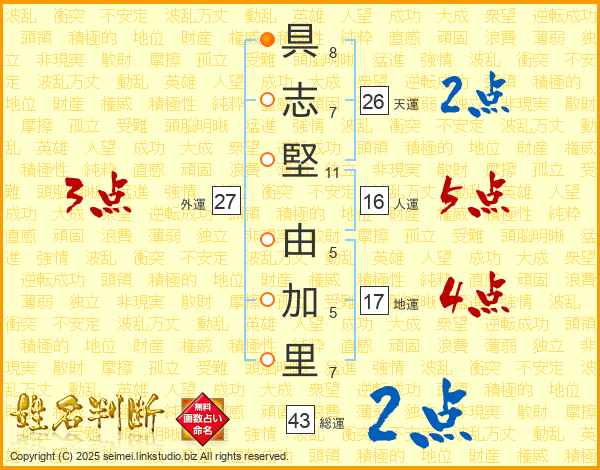具(8画)志(7画)堅(11画) 由(5画)加(5画)里(7画)