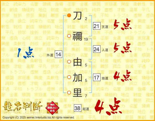 刀(2画)禰(19画) 由(5画)加(5画)里(7画)