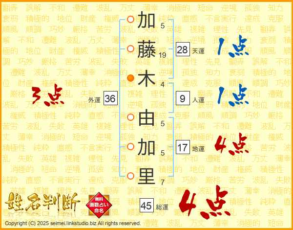 加(5画)藤(19画)木(4画) 由(5画)加(5画)里(7画)